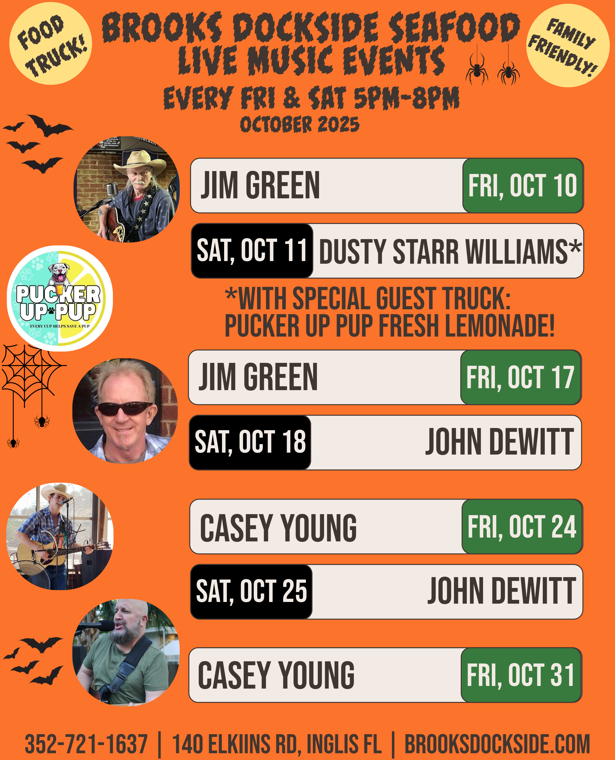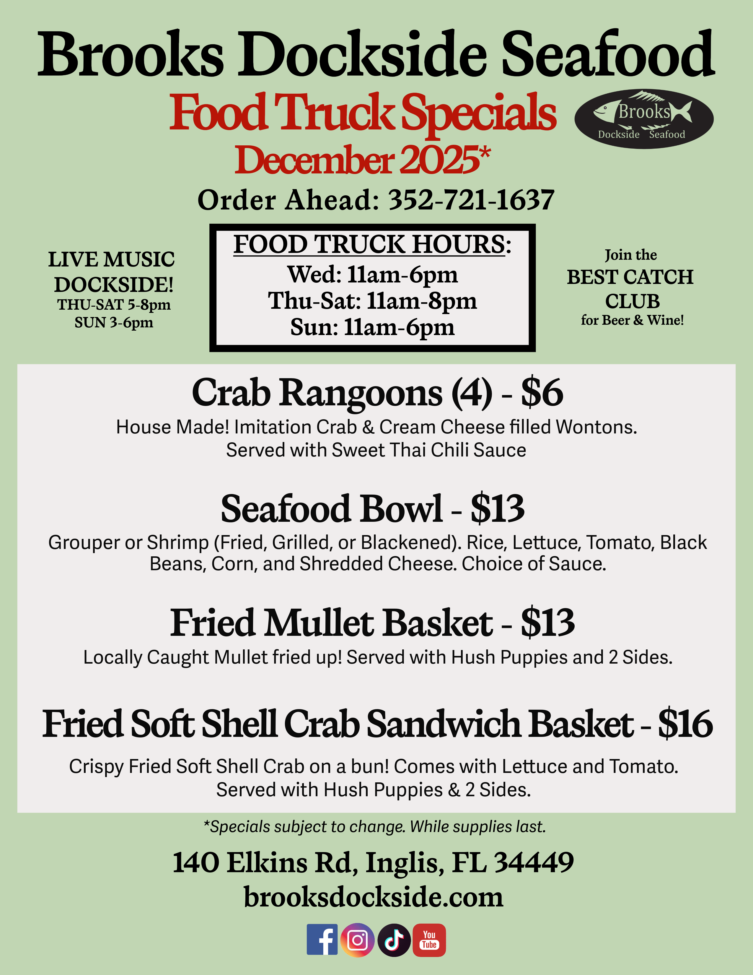 At Brooks Dockside, we serve a variety of Gulf wild-caught seafood directly off our boats, which we unload on our docks and come directly into our food truck. Doesn’t get any fresher than that! We serve Grouper sandwiches – your choice of Fried, Grilled, or Blackened – Shrimp Baskets, Crab Cake Sandwiches, Deviled Crab Rolls, and more! Follow us on Facebook for our Weekly Specials!