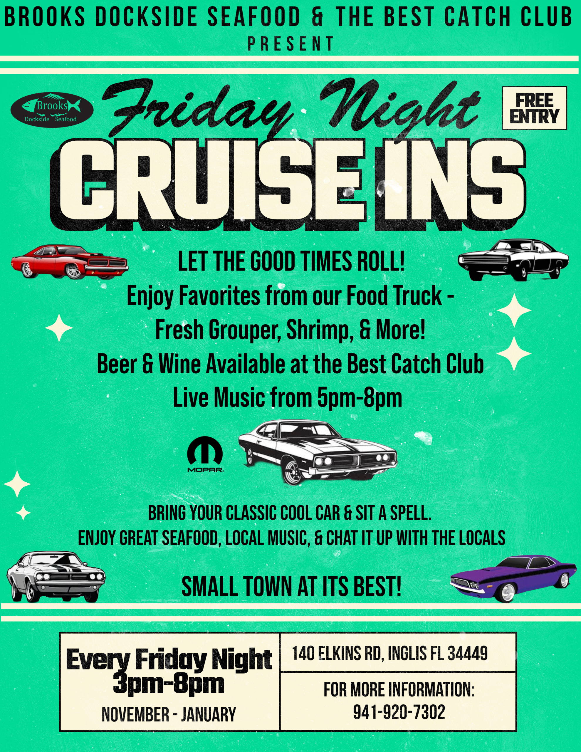 The real-life world of commercial fishing is the setting for your next get-a-way adventure to Brooks Dockside. Whether you’re stopping by for a bite to eat at the food truck, shopping for wild-caught fresh seafood in our Market, or just want to see for yourself what goes on when a real long-line fishing boat arrives back from the Gulf, unloading fresh fish before going to market. We’re easy to find along the Withlacoochee River in Inglis, Florida, just off US Rt. 19 in Florida’s Nature Coast.